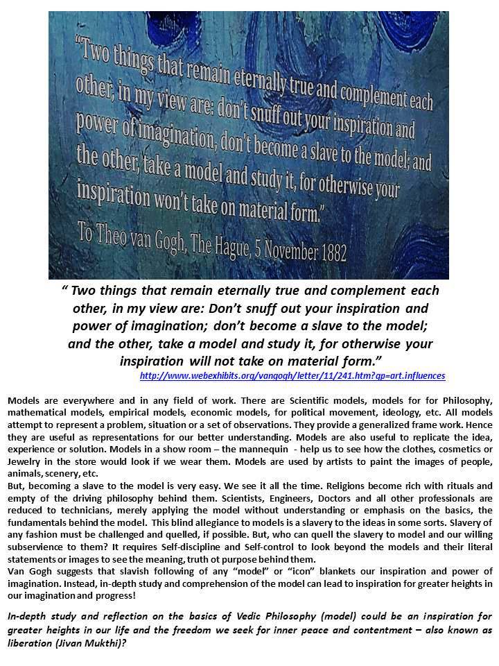 Following are a few slides that capture a few statements from the letters written by the famous painter Vincent Van Gogh. These are from the images displayed in an art exhibition at San Jose CA,, USA titled “Beyond Van Gogh”. The connection between these statements and the basics of Vedic Philosophy commonly known as Vedanta are striking! This complementarity between the two widely differing sources also reflects the true nature of free thought of the human mind and how it it is captured profoundly well in the Vedic Philosophy!