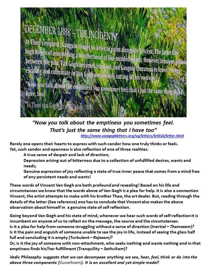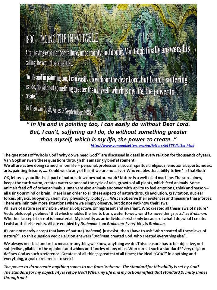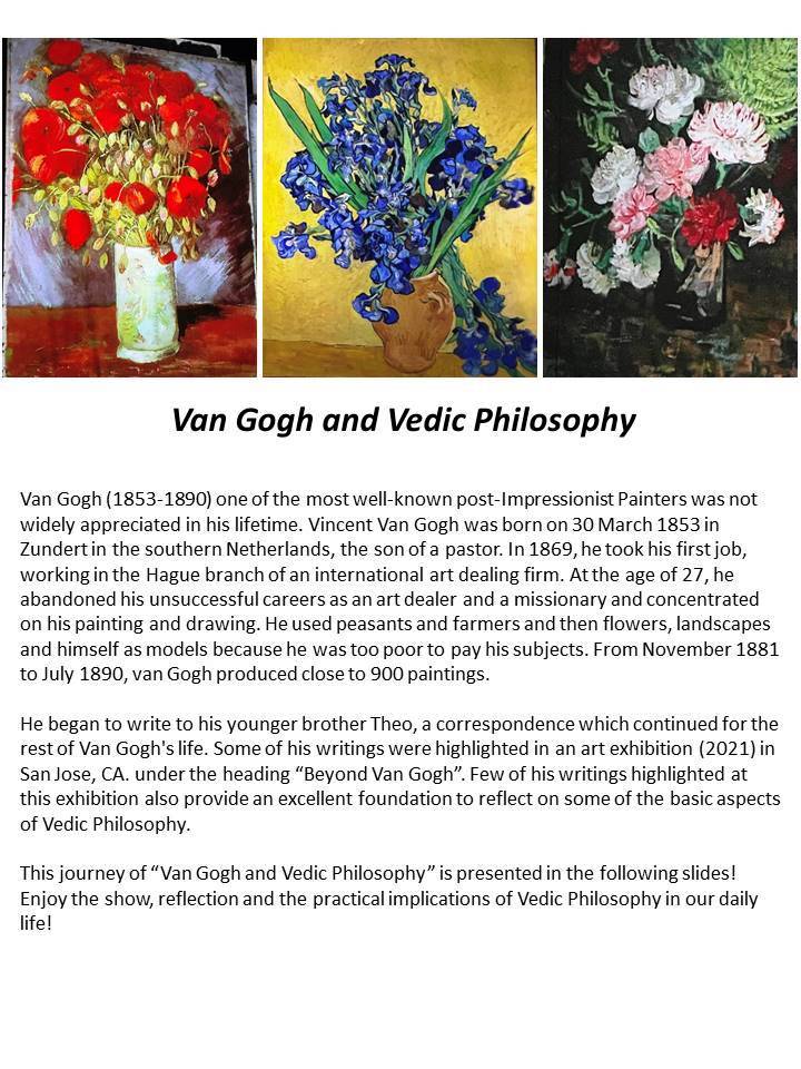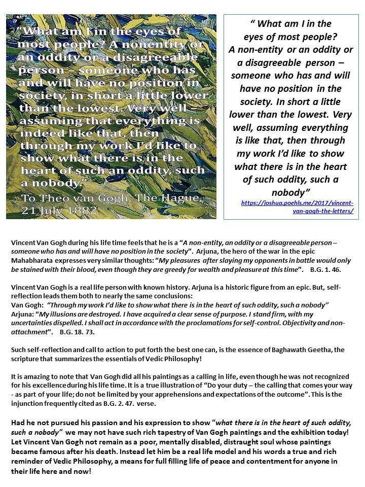 Following are a few slides that capture a few statements from the letters written by the famous painter Vincent Van Gogh. These are from the images displayed in an art exhibition at San Jose CA,, USA titled “Beyond Van Gogh”. The connection between these statements and the basics of Vedic Philosophy commonly known as Vedanta are striking! This complementarity between the two widely differing sources also reflects the true nature of free thought of the human mind and how it it is captured profoundly well in the Vedic Philosophy!
