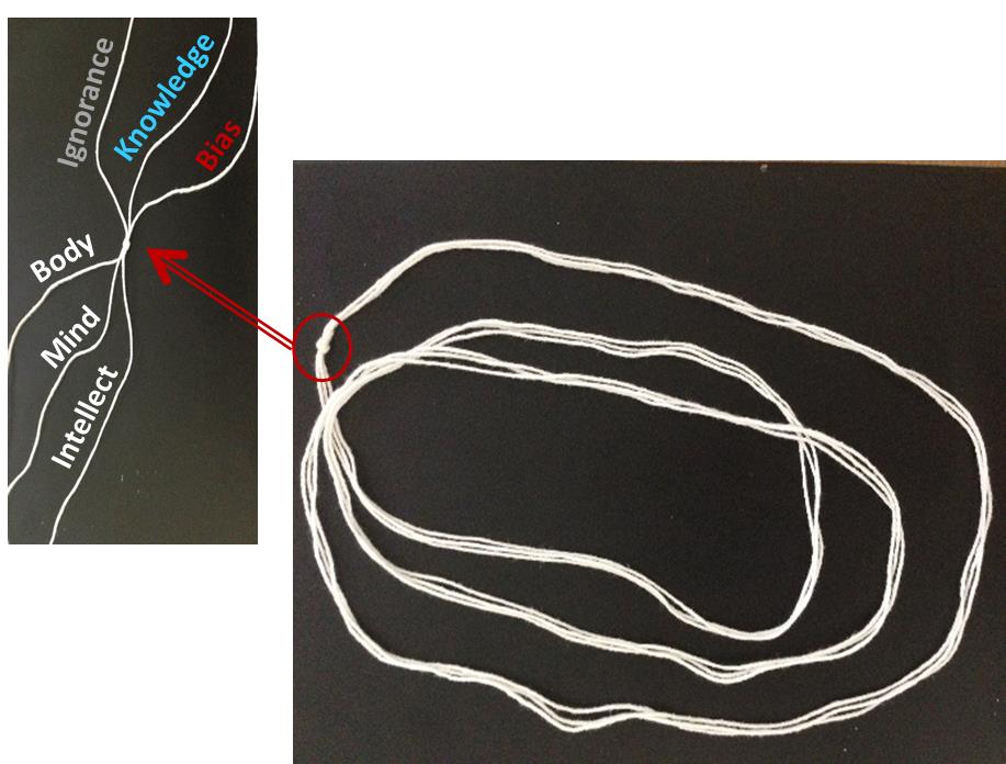 On the other side of the knot are our three equipments of Body, Mind and Intellect through which we get connected to our K, B and I and through which we also endure our “experiences”.